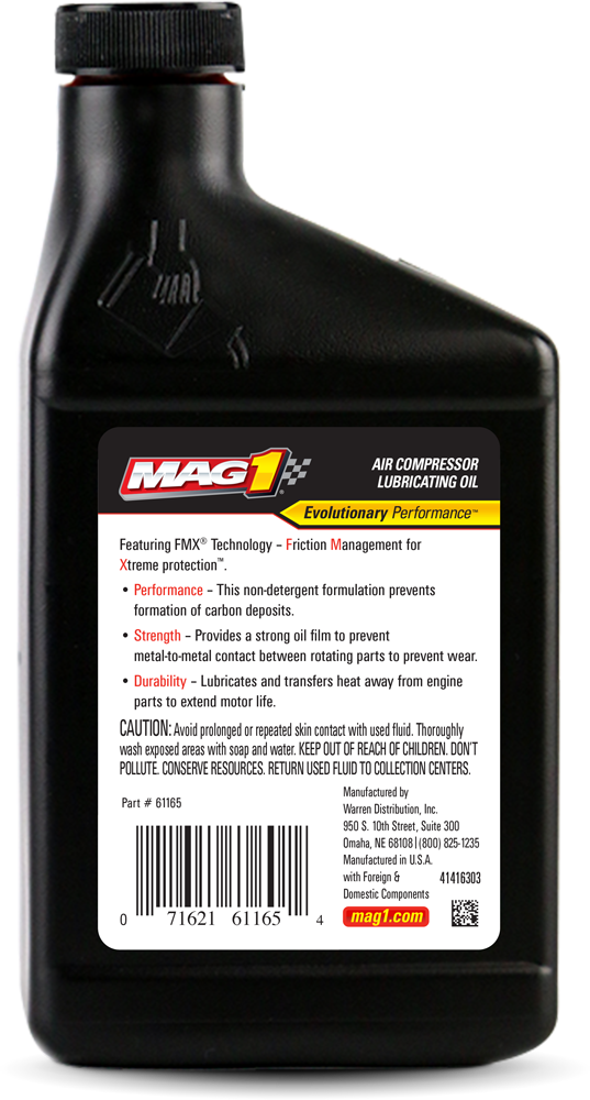 MAG 1® AIR COMPRESSOR OIL is a unique blend of highly refined petroleum base stocks enriched with anti-foam agents. This formula creates a long lasting lubricant that allows smooth operating conditions and helps extend the life of your compressor.