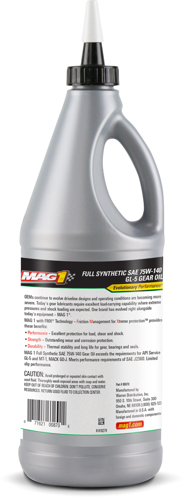 MAG 1® Full Synthetic 75W-140 Gear Lubricant is specially formulated for multipurpose, extreme pressure applications, including conventional differentials, gear boxes, limited slip rear axles, manual transmissions and hypoid gears. Contains only high-quality paraffinic lubricating oils and the most technologically advanced additive system, which includes extreme pressure, anti-wear and anti-friction agents, and oxidation and corrosion inhibitors.