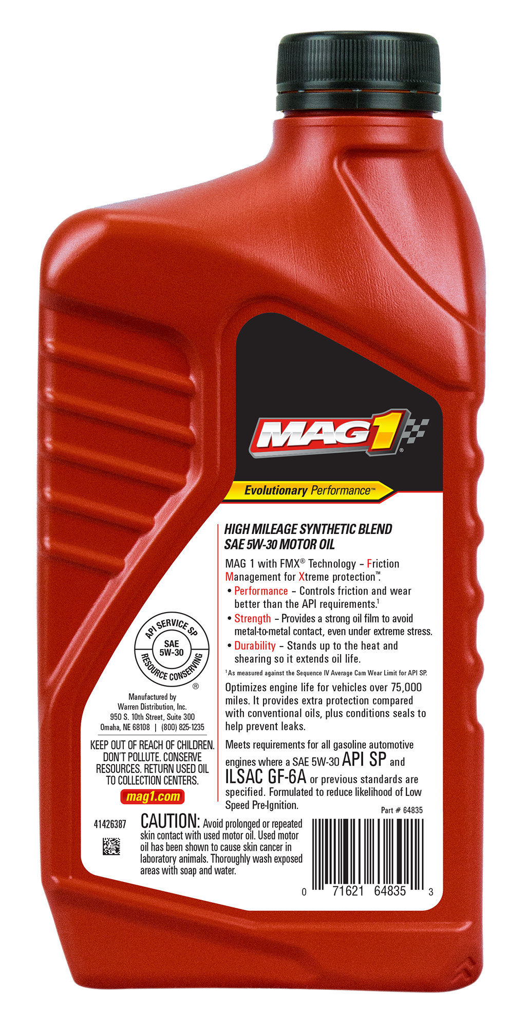 MAG 1® High Mileage Synthetic Blend 5W-30 Motor Oil is formulated to extend engine life for vehicles that have already exceeded 75,000 miles. It seals leaks, features superior oxidation stability, and provides extra protection against sludge, deposit buildup, and high temperatures. It also delivers the following benefits: