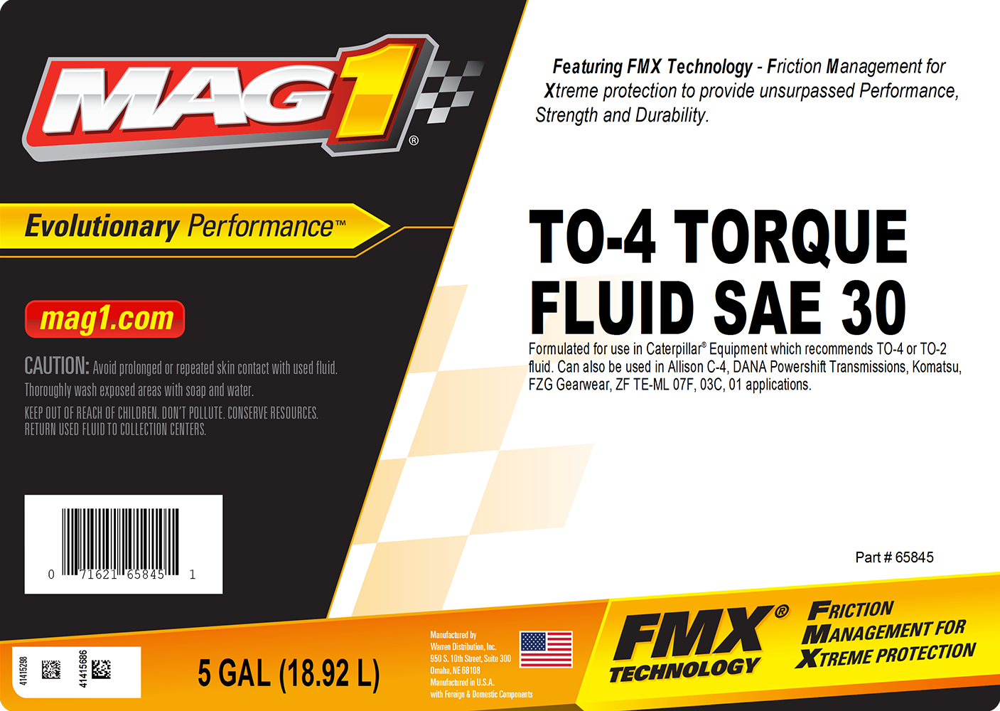 MAG 1 TO-4 Torque Fluid SAE 30 is a multipurpose lubricant designed for use in transmissions, wet brakes and hydraulic systems requiring a fluid meeting Caterpillar® TO-4 requirements. This fluid has outstanding hydraulic oil stability and allows protection against high-pressure pump wear. It provides the following benefits: