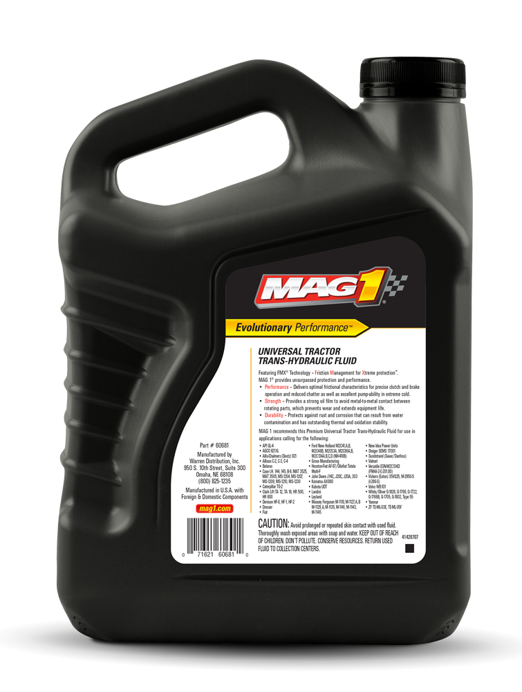 MAG 1 Premium Universal Tractor Trans-Hydraulic Fluid is formulated with high-quality paraffinic base stocks, and is recommended for farm equipment with transmission final drives, wet brakes, clutches, and hydraulics supplied from a common reservoir. Benefits include: