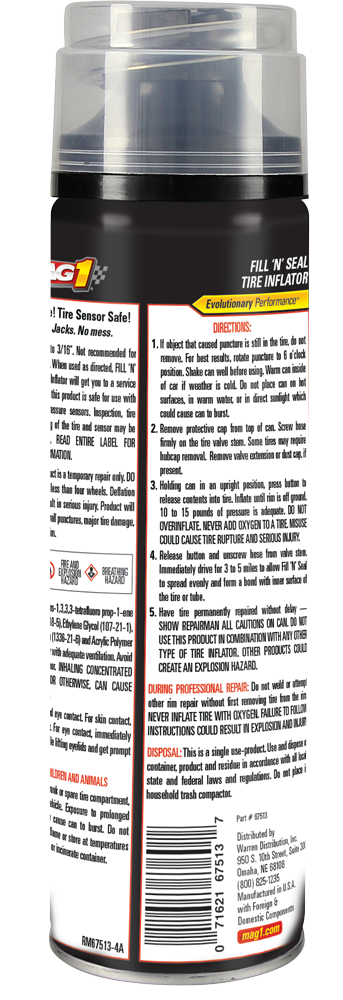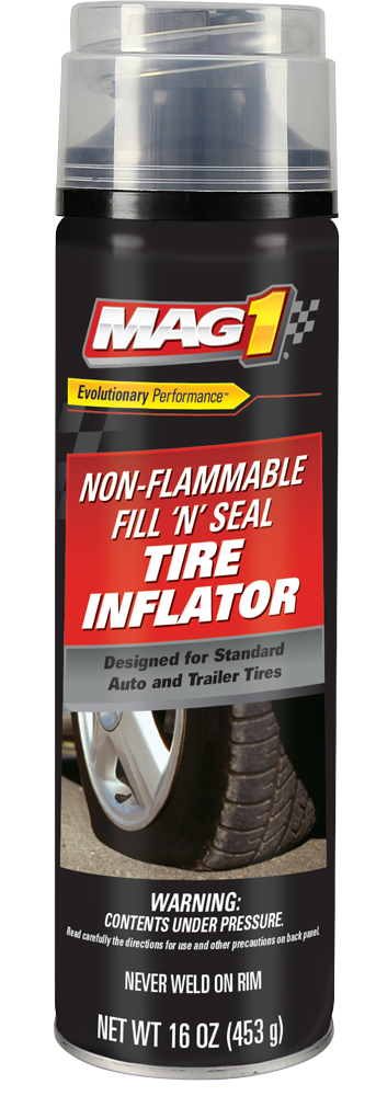 A non-flammable formula to seal and inflate flat tires in seconds. Provides a temporary repair so the driver is not stranded out on the road. Convenient and easy to use; it seals most punctures. Use MAG 1® Fill 'n' Seal, and then drive to a service station or repair shop for help.