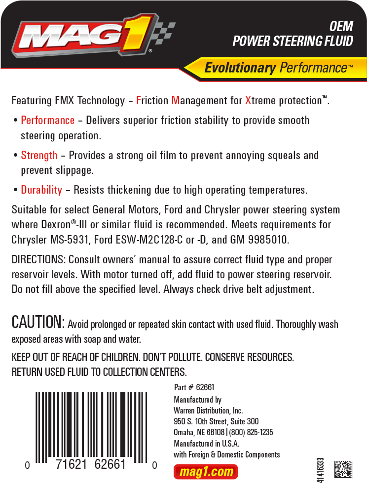 MAG 1® OEM Power Steering Fluid is a specially blended formula that is suitable for select General Motors, Ford and Chrysler power steering systems where Dexron III or similar fluid is recommended. Meets requirements for Chrysler MS-5931, Ford ESW-M2C128-C or -D, and GM 9985010. Recommended for complete fluid refill or top off.